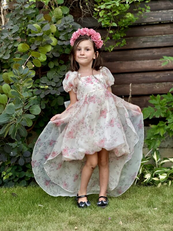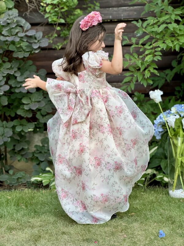 Rochita deosebita cu aplicații florale minunate, cu mâneci bufante, prevăzută la spate cu o funda din același material și cu o mică trena oferind un aspect elegant, căptușită pe interior cu cotton 100%